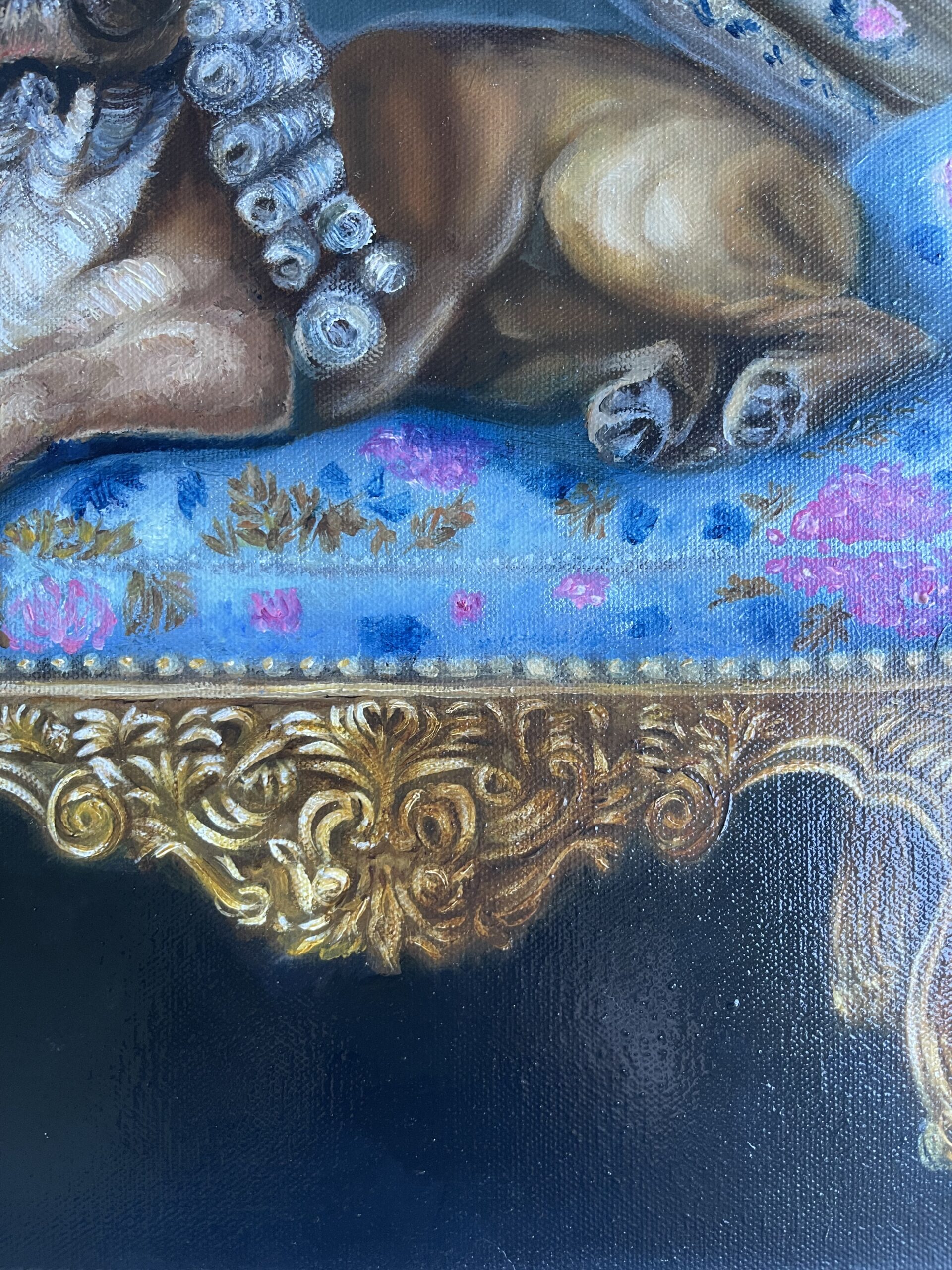 Baroque Bulldog eigt eine französische Bulldogge, die majestätisch auf einer barocken Chaiselongue mit floraler Polsterung liegt, umgeben von einem prachtvollen Vorhang. Das zentrale Element ist die weiße Perücke mit goldenen Schmuckelementen – ein Sinnbild barocker Macht, Eitelkeit und Inszenierung. Das Werk verbindet klassische Porträtmalerei mit einem modernen, humorvollen Ansatz durch die Vermenschlichung des Hundes im höfischen Stil.